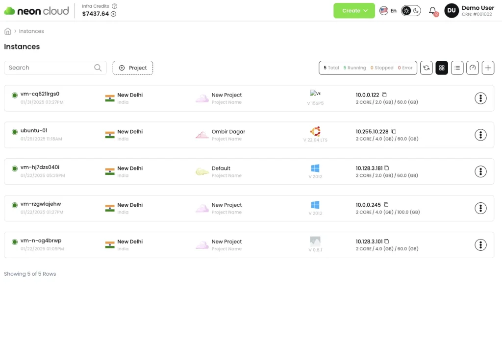 Our primary data center is located in Delhi NCR and the secondary data center is in Mumbai, operating as a colocation. As a recognized leader among cloud hosting providers in India, Neon Cloud ensures top-tier connectivity, low latency, and compliance through these strategic data center locations. This infrastructure supports our standing as one of the best cloud hosting providers in India and helps us deliver reliable services nationwide.